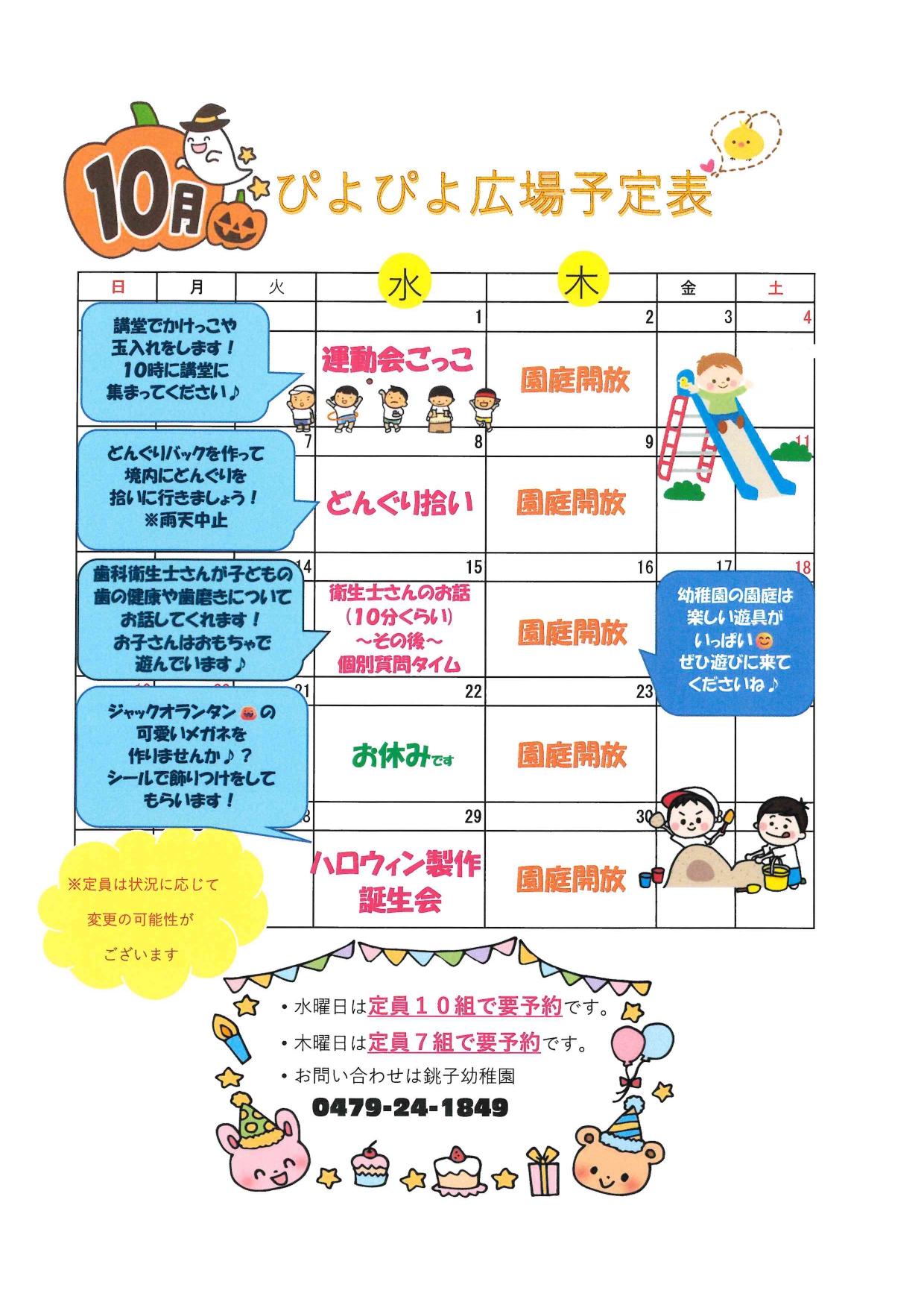 ぴよぴよ広場10月の予定 Instagram 2025/09/19 ぴよぴよ広場・園庭開放は予約制です。 お申し込みの方は、申し込みフォームまたはお電話からお願いします。☏0479-24-1849 お申し込みはこちらから