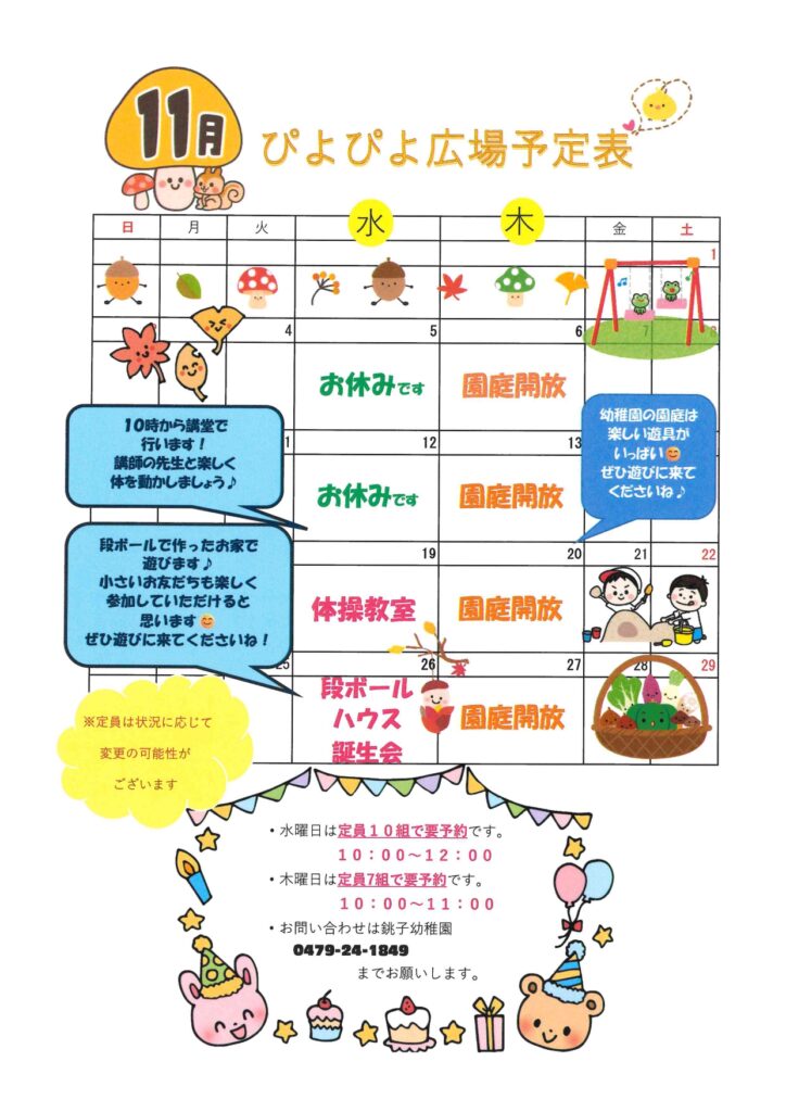 ぴよぴよ広場11月の予定 Instagram 2025/10/21 ぴよぴよ広場・園庭開放は予約制です。 お申し込みの方は、申し込みフォームまたはお電話からお願いします。☏0479-24-1849 お申し込みはこちらから